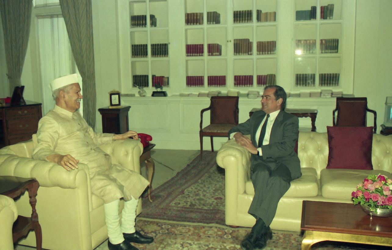 The President of India, Dr. Shankar Dayal Sharma meeting with Shri Dilip Mehta, Ambassador to Bhutan at Rashtrapati Bhavan in New Delhi on April 19, 1995.
