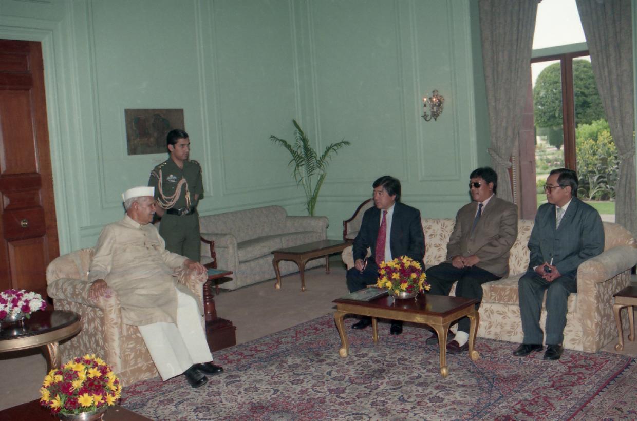 The President of India, Dr. Shankar Dayal Sharma meeting with Shri Gegong Apang, Chief Minister of Arunachal Pradesh with others at Rashtrapati Bhavan in New Delhi on October 13, 1995.