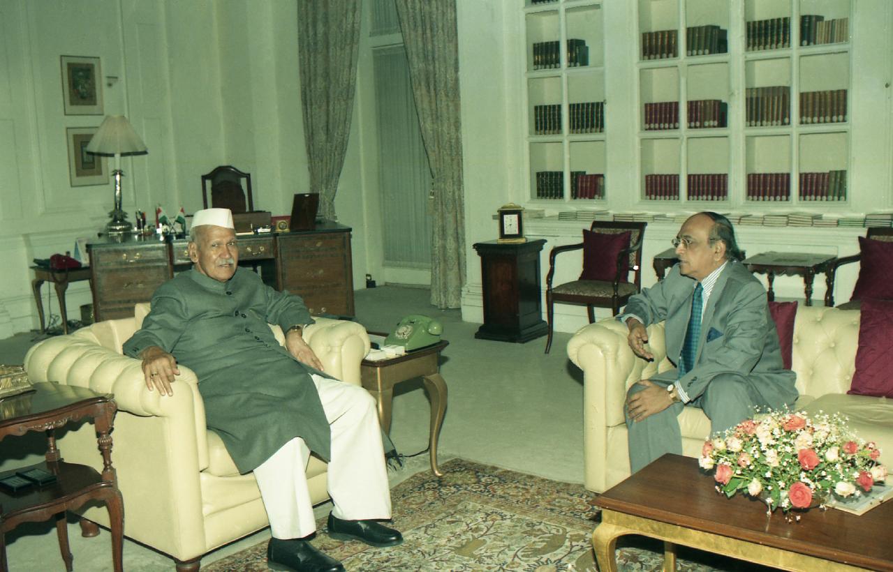 The President of India, Dr. Shankar Dayal Sharma meeting with Shri Hari Govind Singhania at Rashtrapati Bhavan in New Delhi on March 12, 1997.