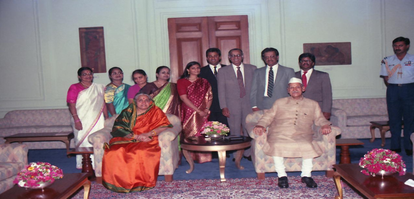 The President of India, Dr. Shankar Dayal Sharma meeting with Shri Justice S. Mohan, Judge, Supreme Court with his family members at Rashtrapati Bhavan in New Delhi on May 19, 1994.