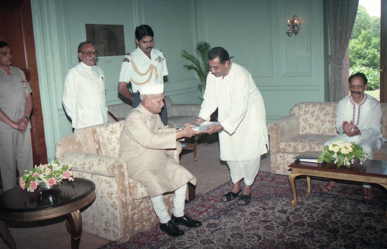 The President of India, Dr. Shankar Dayal Sharma meeting with Shri K.P. Singh Deo at Rashtrapati Bhavan in New Delhi on August 28, 1995.