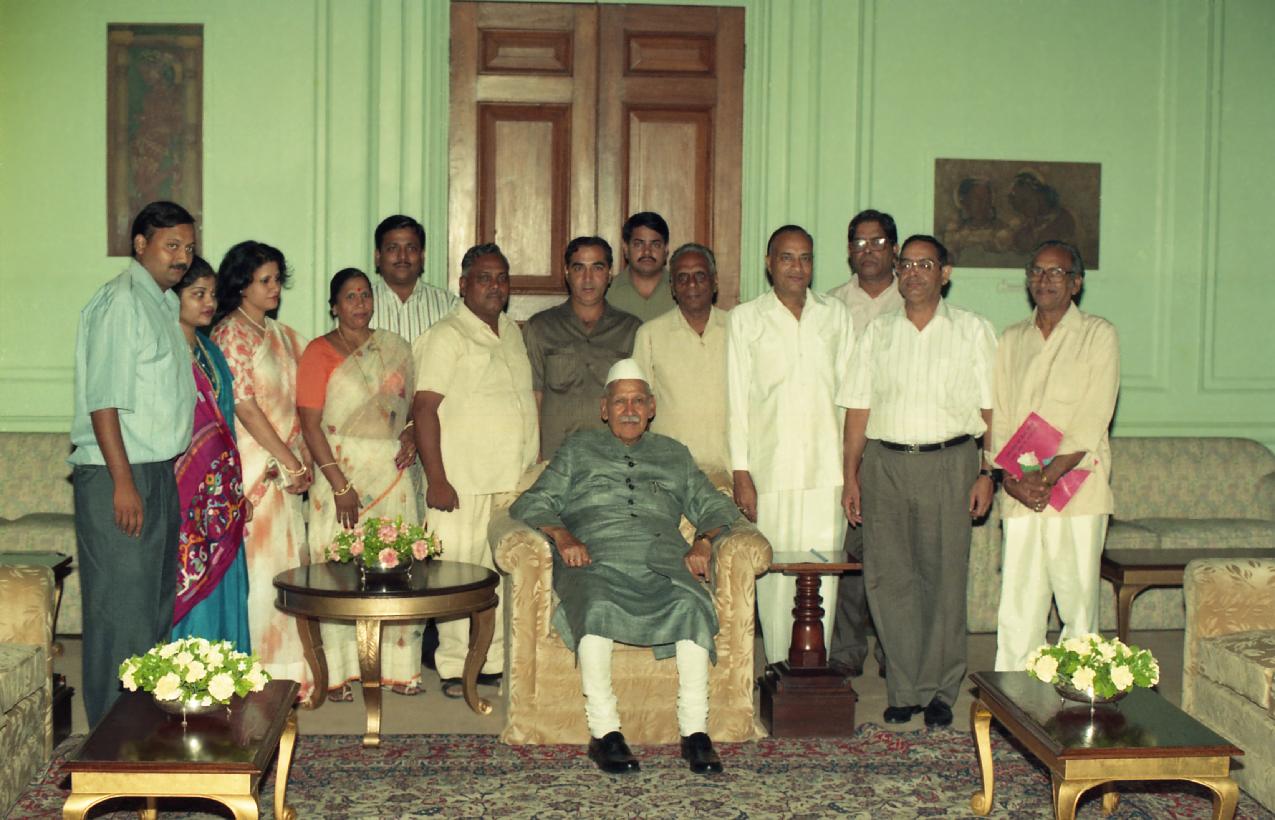 The President of India, Dr. Shankar Dayal Sharma receiving a copy of the Atlas "Uttar Pradesh Ka Boli-Bhoogol" from Dr. Kailash Chander Aggarwal at Rashtrapati Bhavan in New Delhi on August 07, 1996.