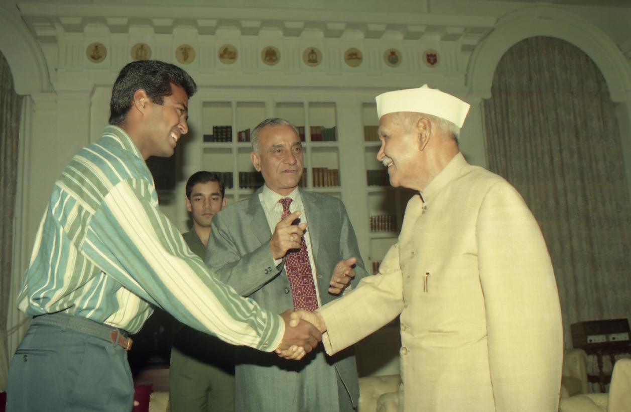 The President of India, Dr. Shankar Dayal Sharma meeting with Leander Peas at Rashtrapati Bhavan in New Delhi on August 08, 1996.