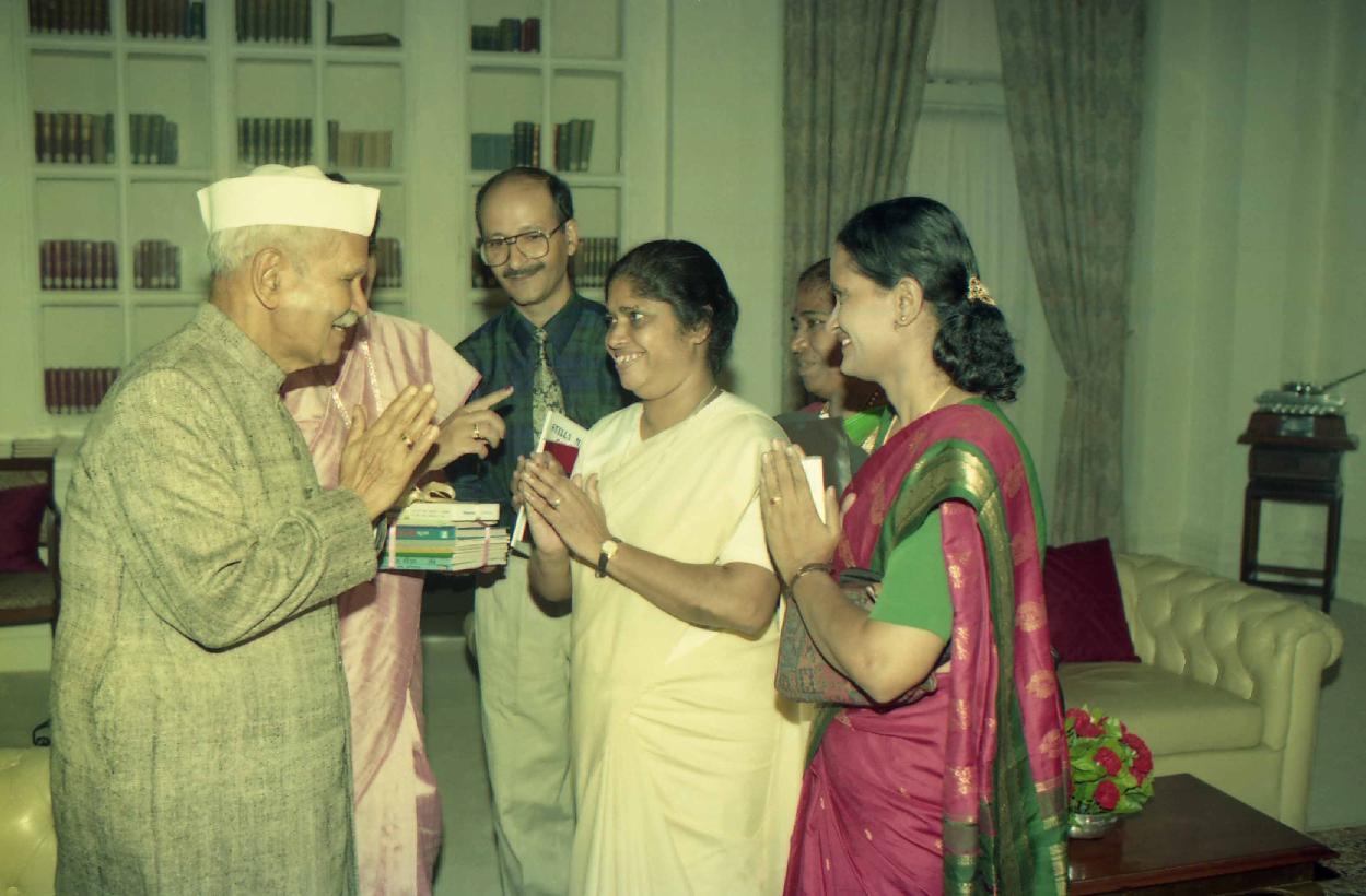 The President of India, Dr. Shankar Dayal Sharma receiving a video cassette "Aaiye Hindi Bolna Seekhen" from Dr. Madhu Dhawan with others from Stella Maris College, Madras at Rashtrapati Bhavan in New Delhi on August 24, 1996.