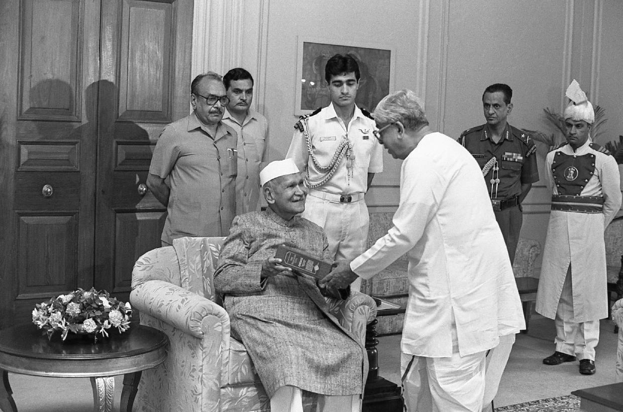 The President of India, Dr. Shankar Dayal Sharma receiving a copy of the book "Commentary on Gita" of Paramhansa Yoganandaji from Shri Justice R.M. Dutta, Vice-President, Yogoda Satsang Society of India at Rashtrapati Bhavan in New Delhi on September 02, 1996.