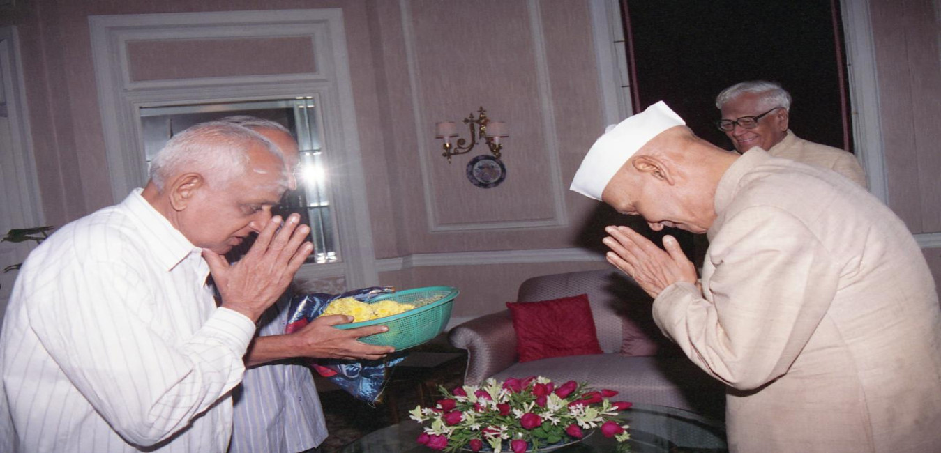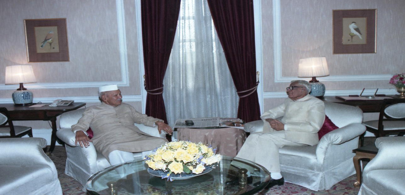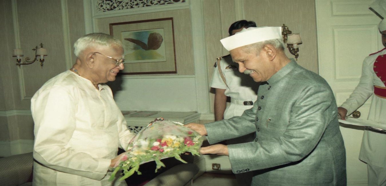The President of India, Dr. Shankar Dayal Sharma meeting with Shri R. Venkataraman, former President at Rashtrapati Bhavan in New Delhi on July 26, 1994.