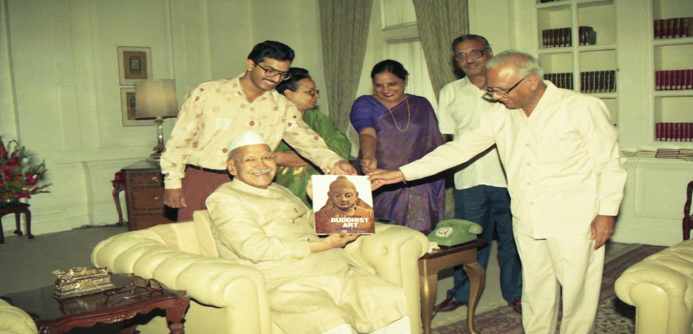 The President of India, Dr. Shankar Dayal Sharma receiving a copy of the book Buddhist Art from Prof. R.C. Sharma at Rashtrapati Bhavan in New Delhi on August 16, 1995.