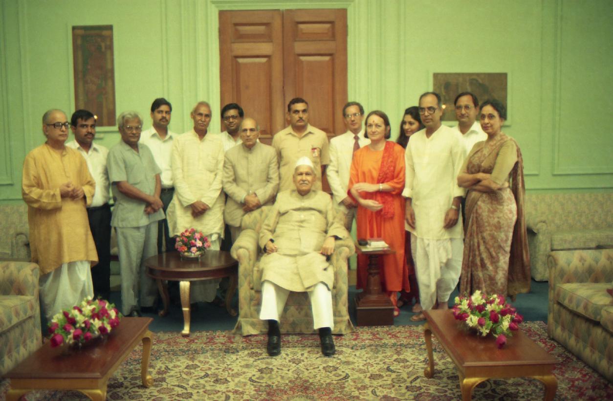 The President of India, Dr. Shankar Dayal Sharma receiving the copies of the books "Charming Krishna" & "Yamunashtakam" from Ms. Rozalia Radhika Priya at Rashtrapati Bhavan in New Delhi on August 05, 1995.
