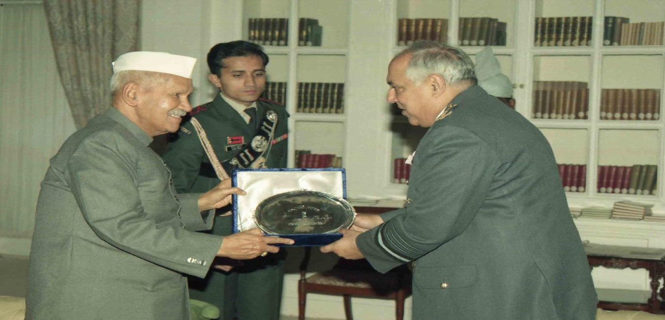 Air Chief Marshal S.K. Kaul, Chief of the Air Staff pays farewell call on the President of India, Dr. Shankar Dayal Sharma, at Rashtrapati Bhavan in New Delhi on December 26, 1995.