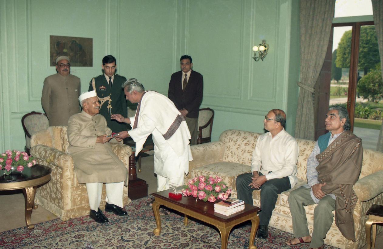 The President of India, Dr. Shankar Dayal Sharma receiving copies of the books "Yoga for Backache & Neckache" and "Yoga for Asthma" from Shri S.P. Nimbalkar at Rashtrapati Bhavan in New Delhi on January 11, 1997.