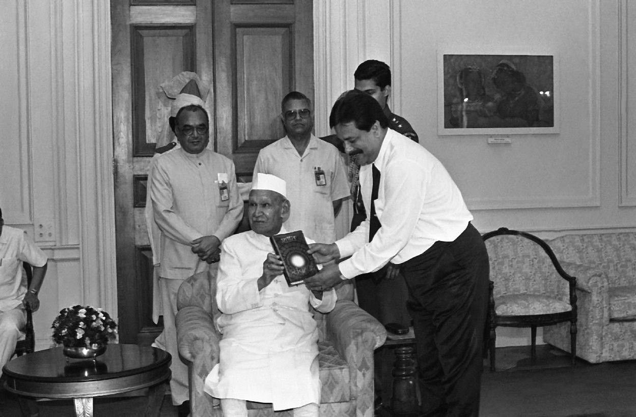 The President of India, Dr. Shankar Dayal Sharma receiving a copy of the book "Shanti Sukh Aur Santushti" from Shri Subrat Rai Sahara at Rashtrapati Bhavan in New Delhi on March 28, 1995.