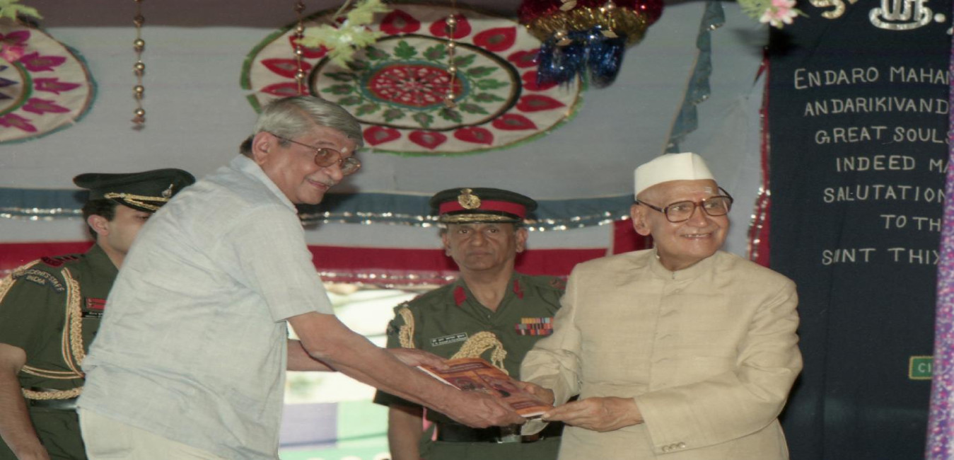 The President of India, Dr. Shankar Dayal Sharma inaugurating the 150th Aradhana Festival of Sri Thiagabrahma and presenting copy of the Souvenir in commemoration of 150th Aradhana Festival to Shri TT Vasu, at Thiruvaiyaru, in Tamil Nadu on January 20, 1997.