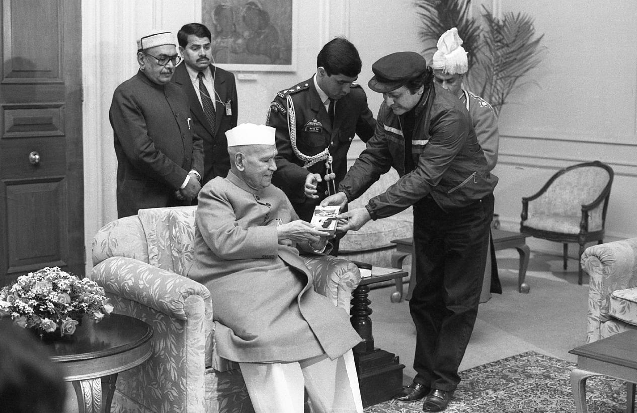 The President of India, Dr. Shankar Dayal Sharma receiving Video cassette of the documentary film "Amar Netaji" from Shri Vishwajeet at Rashtrapati Bhavan in New Delhi on January 22, 1997.