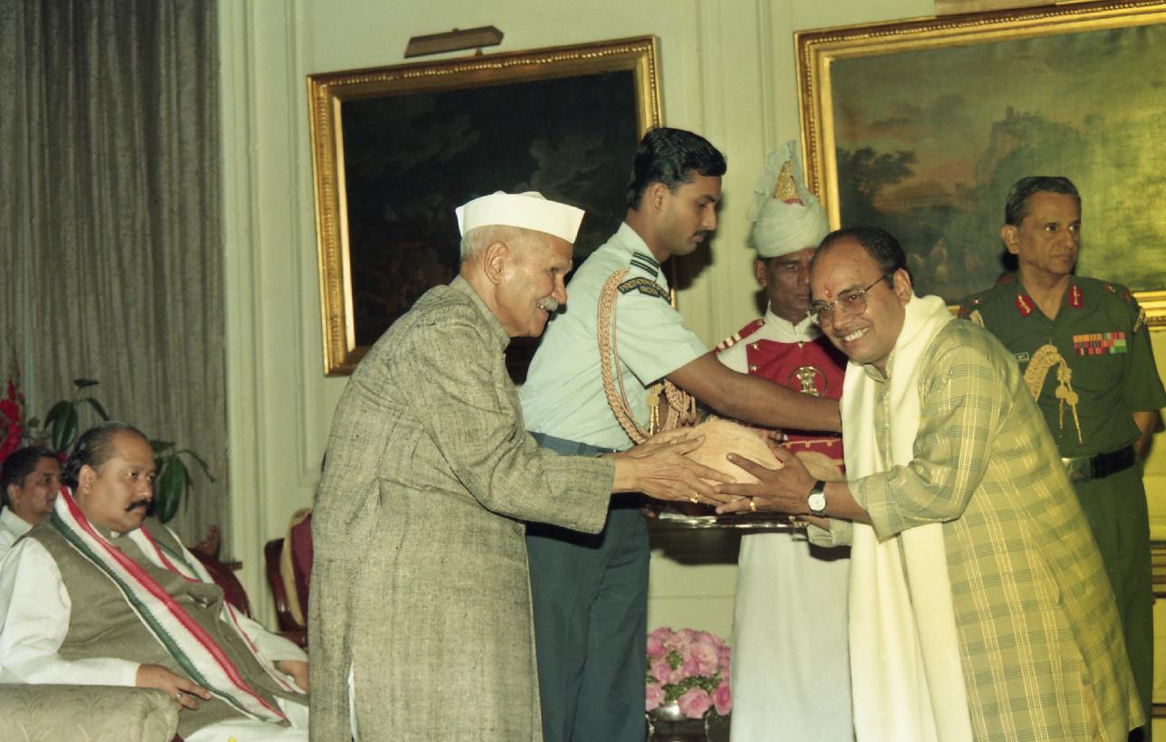 The President of India, Dr. Shankar Dayal Sharma receiving a set of publications brought out by the Research Foundation for Science Technology and Natural Resource Policy at Rashtrapati Bhavan in New Delhi on April 04, 1997.