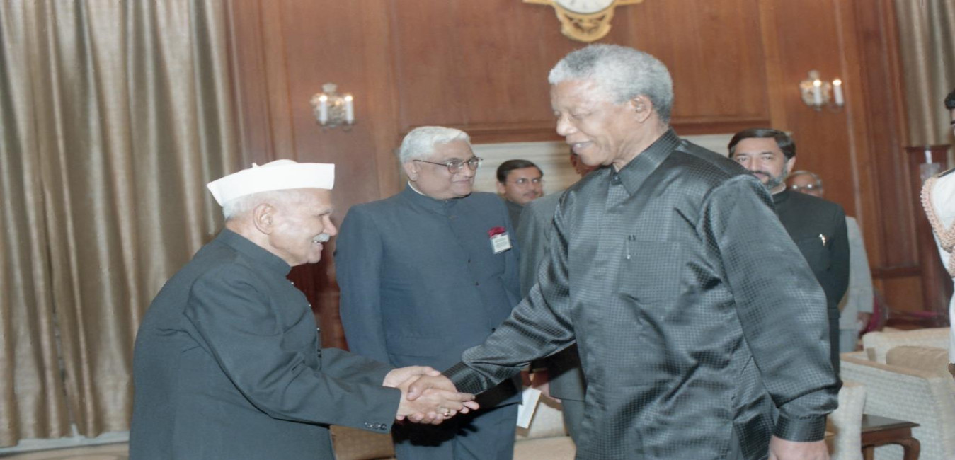 The President of the Republic of South Africa, H.E. Dr. Nelson R. Mandela calling on the President of India, Dr. Shankar Dayal Sharma, at Rashtrapati Bhavan in New Delhi on March 27, 1997.