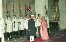 The President of India, Dr. Shankar Dayal Sharma receiving the President of the Republic of South Africa, H.E. Dr. Nelson R. Mandela and H.R.H. Princess Zenani Mandela-Dlamini at their Ceremonial Reception, at Rashtrapati Bhavan in New Delhi on March 27, 1997.