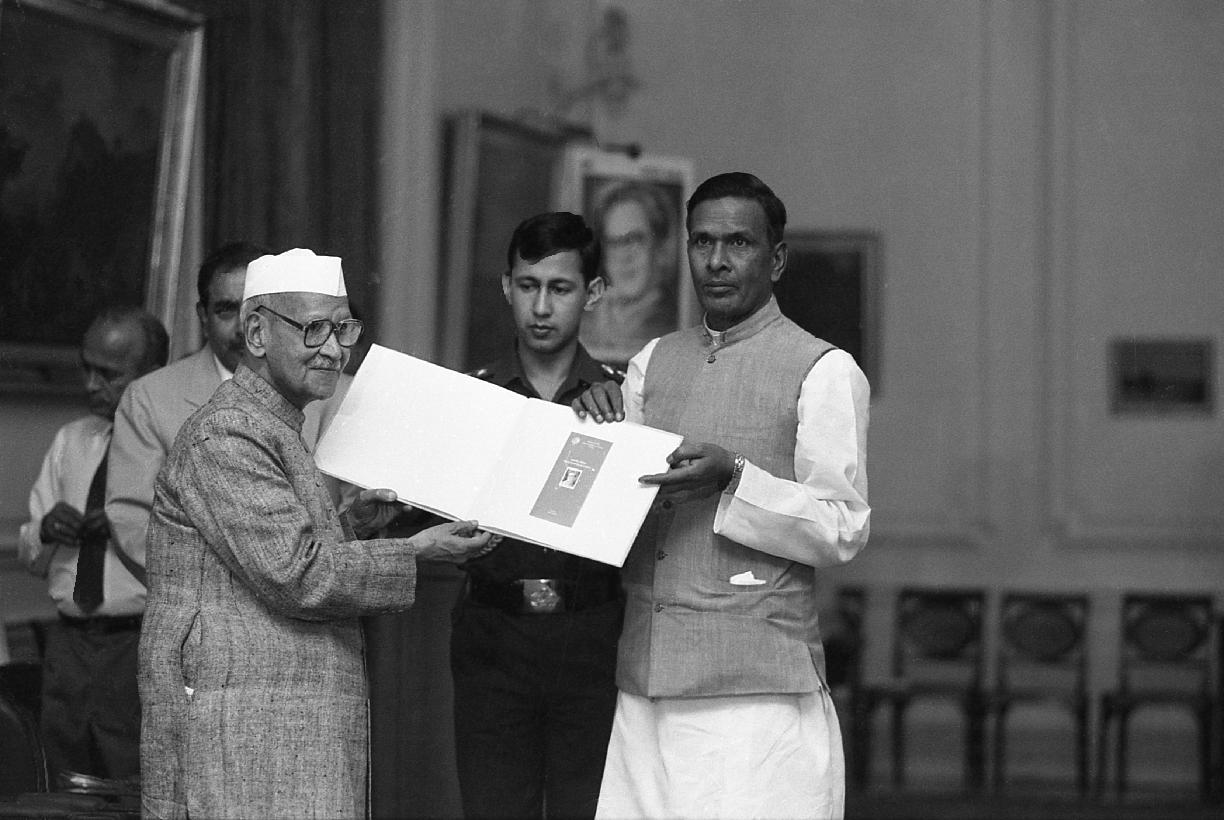 The President of India, Dr. Shankar Dayal Sharma releasing a commemorative postage stamp in the memory of late Dr. Ram Manohar Lohia at Rashtrapati Bhavan in New Delhi on March 23, 1997.