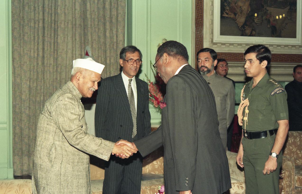 The Secretary General of the Commonweath, HE Chief Emeka Anyaoku calling on the President of India, Dr. Shankar Dayal Sharma, at Rashtrapati Bhavan in New Delhi on March 18, 1997.