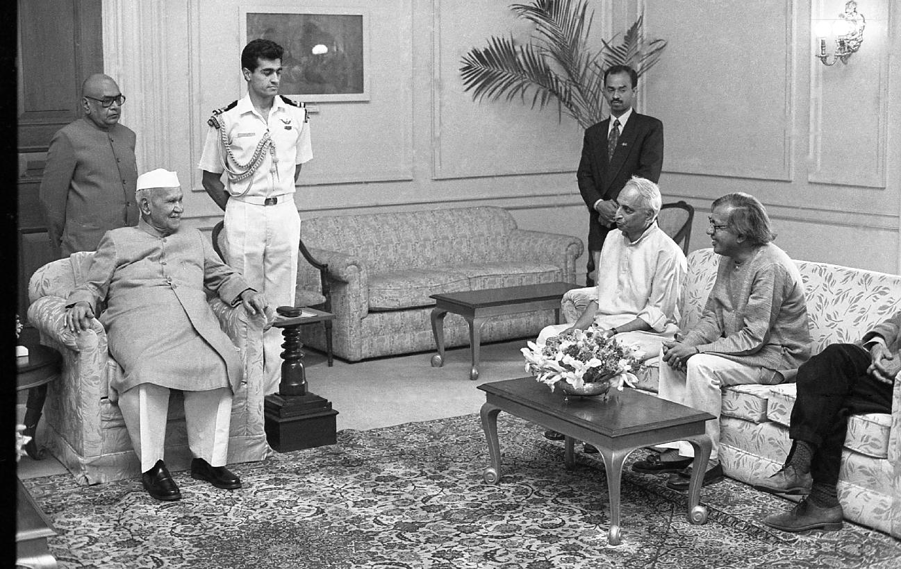 The President of India, Dr. Shankar Dayal Sharma meeting with the former President of India, Shri R. Venkataraman, at Rashtrapati Bhavan, in New Delhi on March 14, 1997.