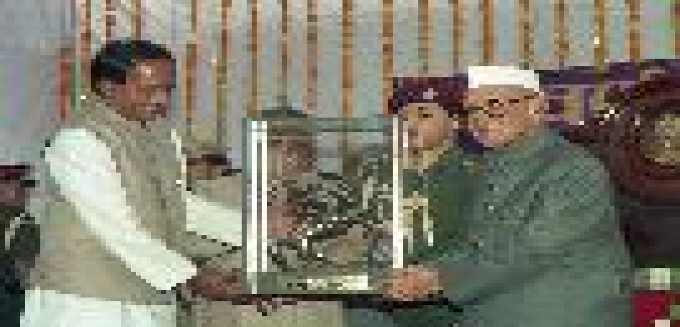 The President of India, Dr. Shankar Dayal Sharma receiving collected Works of Pandit Govind Ballabh Pant from Shri B.R. Nanda, Chief Editor at Rashtrapati Bhavan in New Delhi on March 11, 1997.