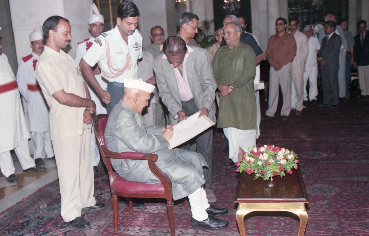 The President of India, Dr. Shankar Dayal Sharma attending dinner to the President Elect, Prime Minister and Council of Ministers at Rashtrapati Bhavan in New Delhi on July 19, 1997