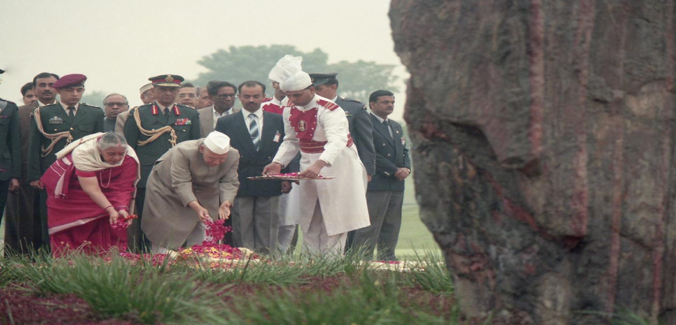 The President of India, Dr. Shankar Dayal Sharma paying floral tributes at the Samadhi of late Smt. Indira Gandhi, on her birth anniversary, at Shakti Sthal in New Delhi on November 19, 1996.