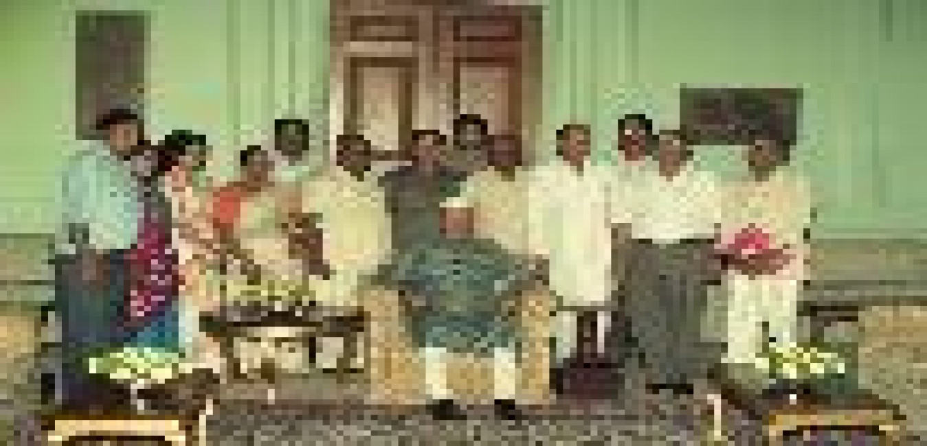 The President of India, Dr. Shankar Dayal Sharma receiving greetings from the Vice-President, Shri K.R. Narayanan, the Prime Minister, Shri H.D. Deve Gowda, the former Prime Minister, Shri P.V. Narasimha Rao, Minister of HRD, Shri S.R. Bommai and Shri Atal Bihari Vajpayee, on his birthday, at Rashtrapati Bhavan in New Delhi on August 19, 1996.