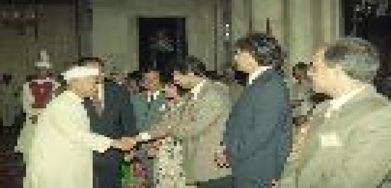 The President of India, Dr. Shankar Dayal Sharma receiving greetings from the Officers and Staff of Rashtrapati Bhavan and people of all walks of life on his birthday, at Rashtrapati Bhavan in New Delhi on August 19, 1996.