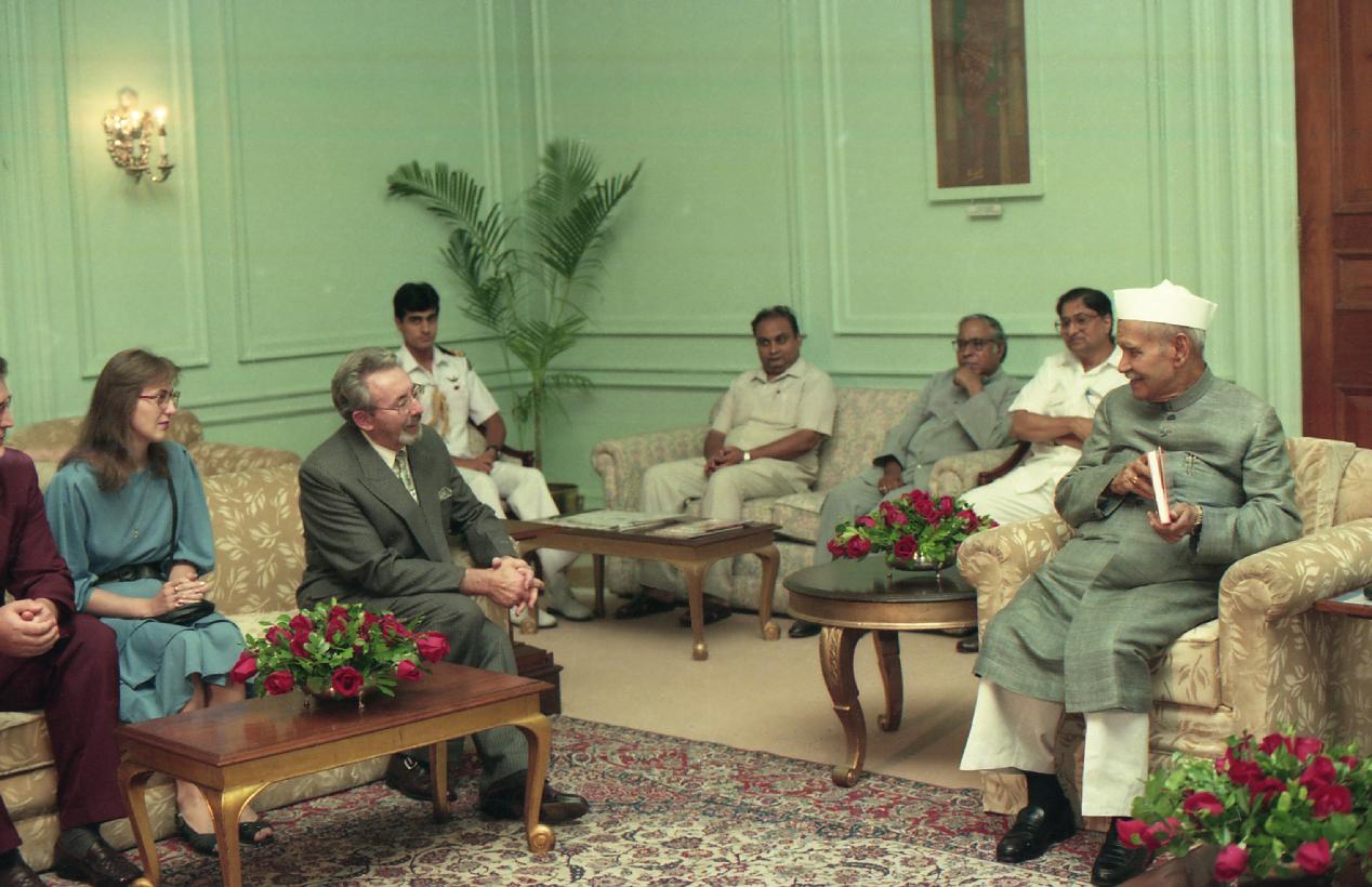 The President of India, Dr. Shankar Dayal Sharma receiving a copy of the books "Discovering Human Potential Energy Kundalini" from Dr. Lajpat Rai at Rashtrapati Bhavan in New Delhi on July 19, 1996.