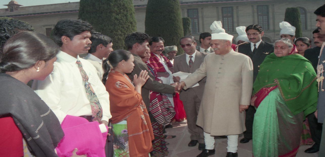 The President of India, Dr. Shankar Dayal Sharma meeting with Republic Day Tribal Guests and Tableau Artists at Rashtrapati Bhavan in New Delhi on January 31, 1996.