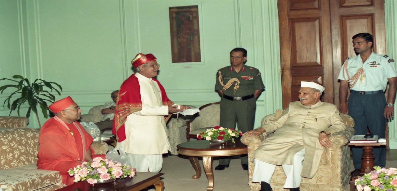 The President of India, Dr. Shankar Dayal Sharma receiving copy of Book "Shree Swaminarayan Bapa Charitramrut Sukhsagar Granth" brought out by Shree Swaminarayan Gadi Sansthan Trust, Ahmedabad at Rashtrapati Bhavan in New Delhi on June 21, 1997.