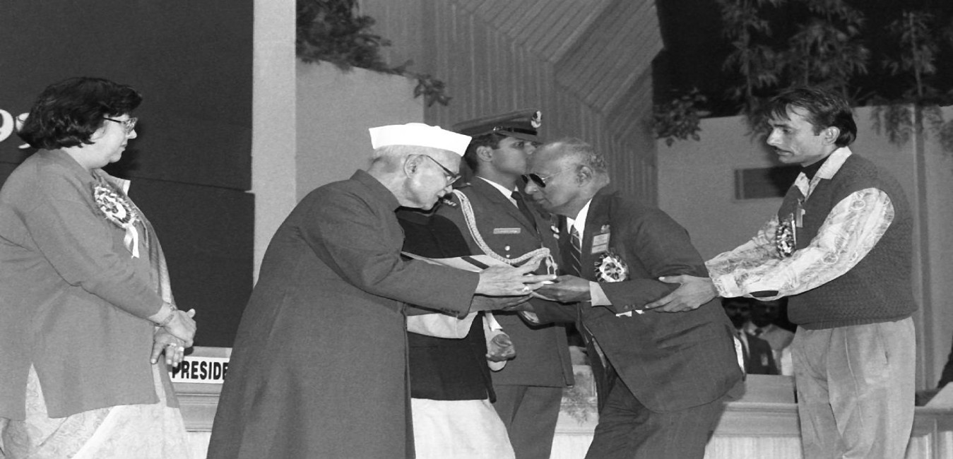 The President of India, Dr. Shankar Dayal Sharma presenting the National Awards for the Welfare of the Handicapped at Vigyan Bhavan in New Delhi on December 03, 1995.
