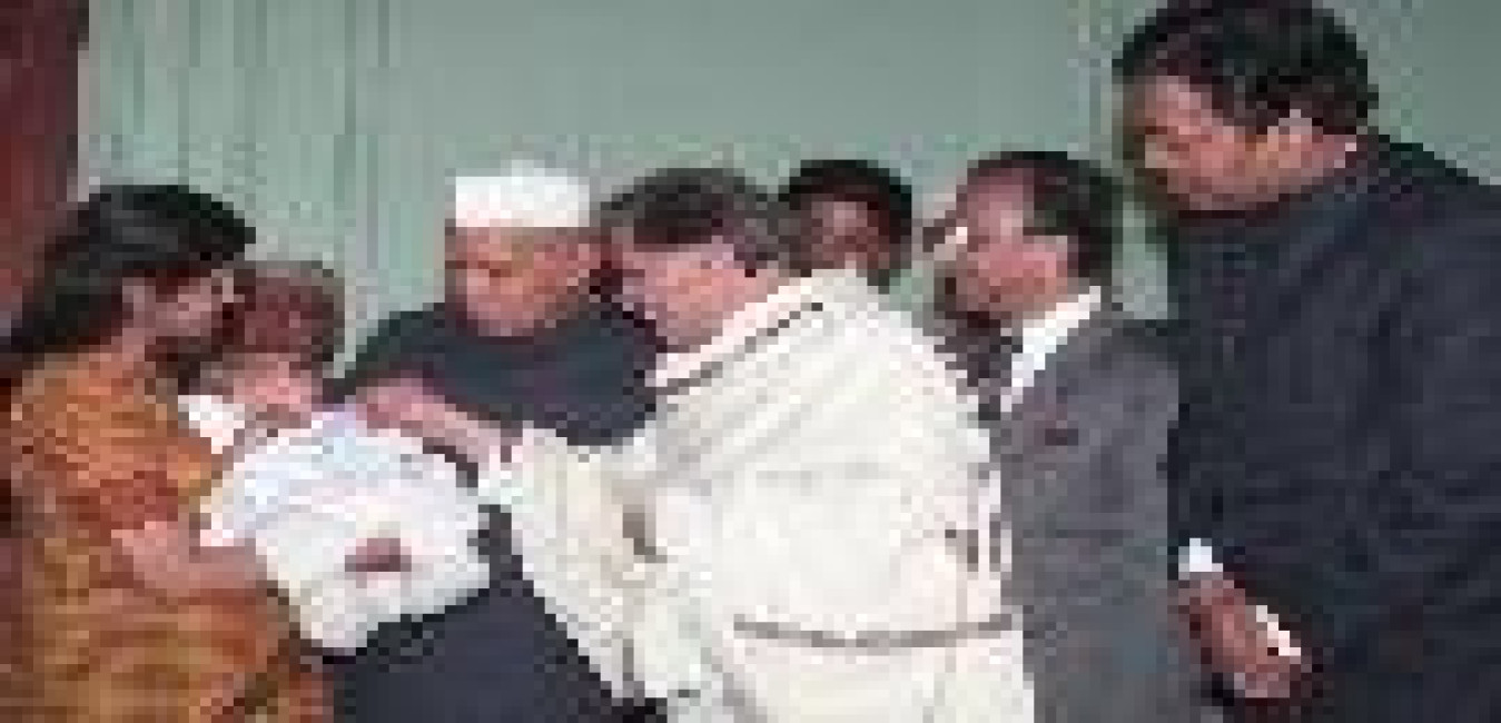 The President of India, Dr. Shankar Dayal Sharma meeting with Shri A.R. Antulay, Minister of Health & Family Welfare alongwith representatives of Rotary International iand launching the social mobilisation programme for Pulse Polio Immunisation by administering polio drops to children, at Rashtrapati Bhavan in New Delhi on November 29, 1995.