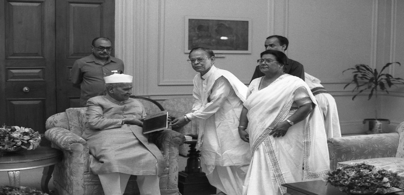 The President of India, Dr. Shankar Dayal Sharma meeting with Dr. Sriram Velankar at Rashtrapati Bhavan in New Delhi on June 10, 1997.