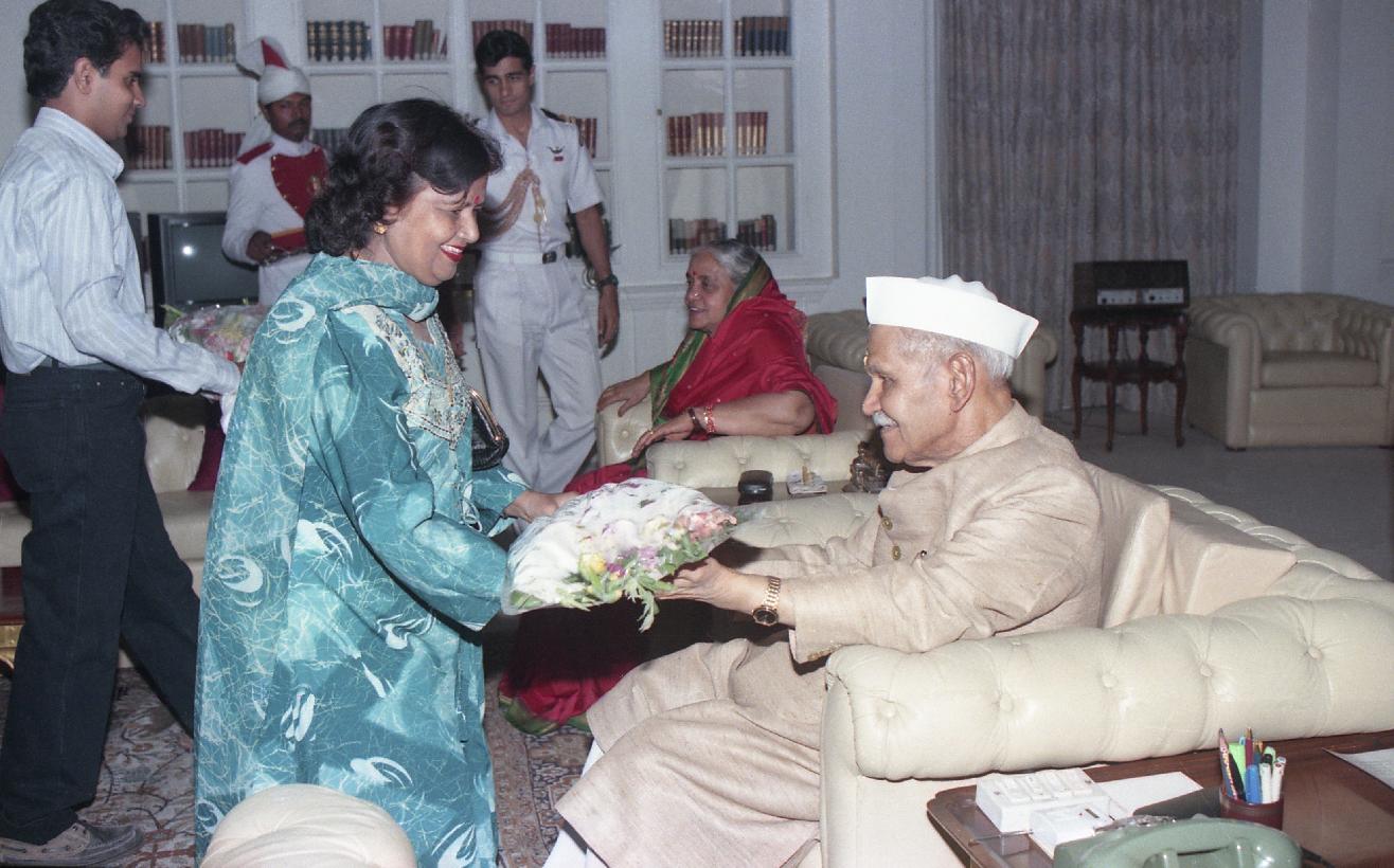 The President of India, Dr. Shankar Dayal Sharma meeting with Mrs. Sarala Malhotra, at Rashtrapati Bhavan in New Delhi on June 10, 1997.