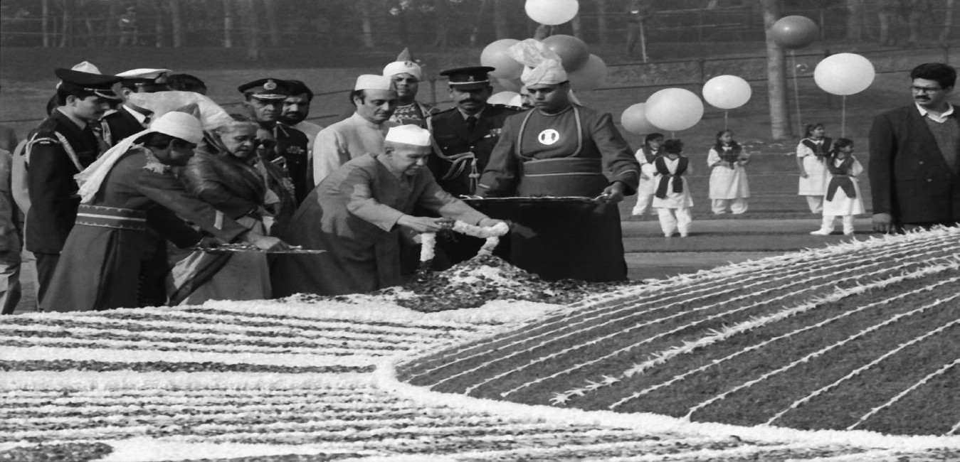 The President of India, Dr. Shankar Dayal Sharma paying floral tributes at the Samadhi of late Pandit Jawaharlal Nehru on the occasion of his birth anniversary, at Shantivana, in Delhi on November 14, 1994.