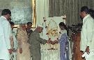 The President of India, Dr. Shankar Dayal Sharma receiving a cassette on Sant Dnyaneshwar brought out by the Dnyan Vidnyan Darshan, Pune at Rashtrapati Bhavan in New Delhi on May 21, 1997