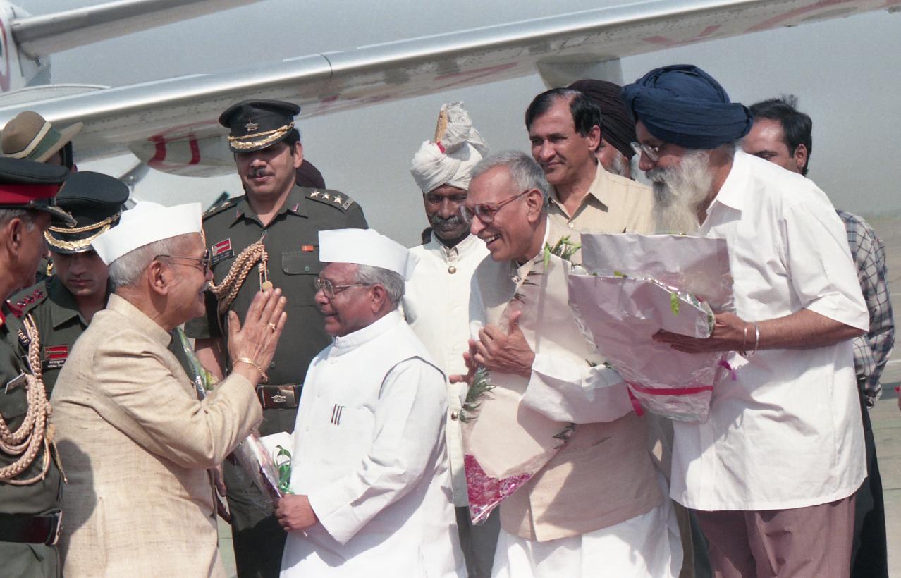 The President of India, Dr. Shankar Dayal Sharma being received by the Governor, Haryana, Shri Mahabir Prasad, the Chief Minister, Haryana, Shri Bansi Lal and the Chief Minister, Punjab, Shri Prakash Singh Badal at Chandigarh airport on May 22, 1997