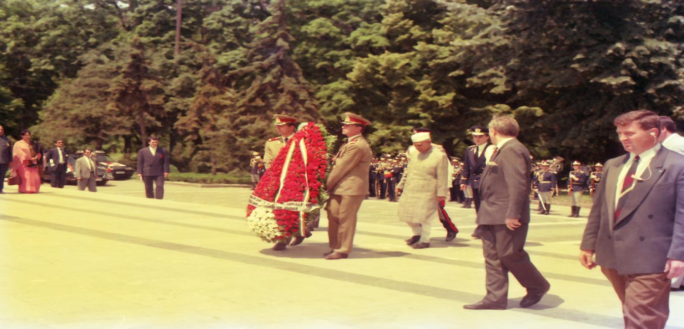 The President of India, Dr. Shankar Dayal Sharma laying wreath at the Unknown Soldiers' Memorial, at Bucharest, in Romania on May 30, 1994.