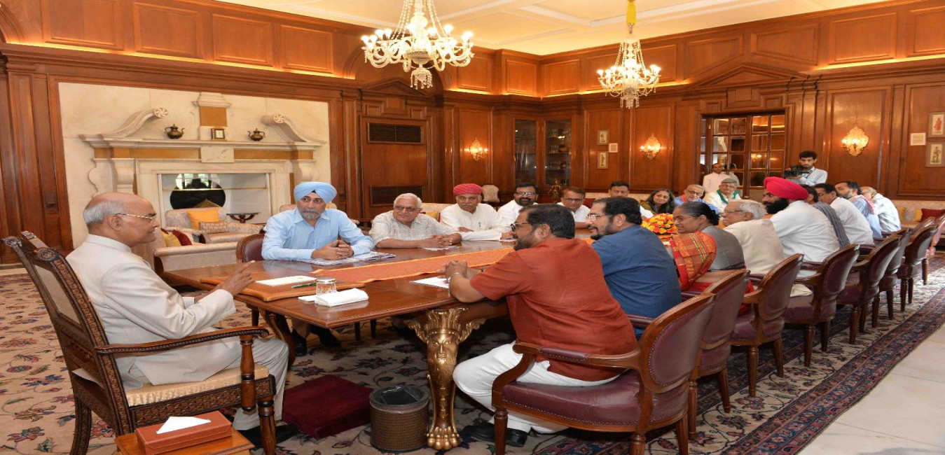 A delegation of All India Kisan Sangharsh Co-ordination Committee led by Shri Raju Shetti, MP (LS) and Shri K.K. Ragesh, MP (RS) meeting with the President of India, Shri Ram Nath Kovind, at Rashtrapati Bhavan on May 28, 2018.