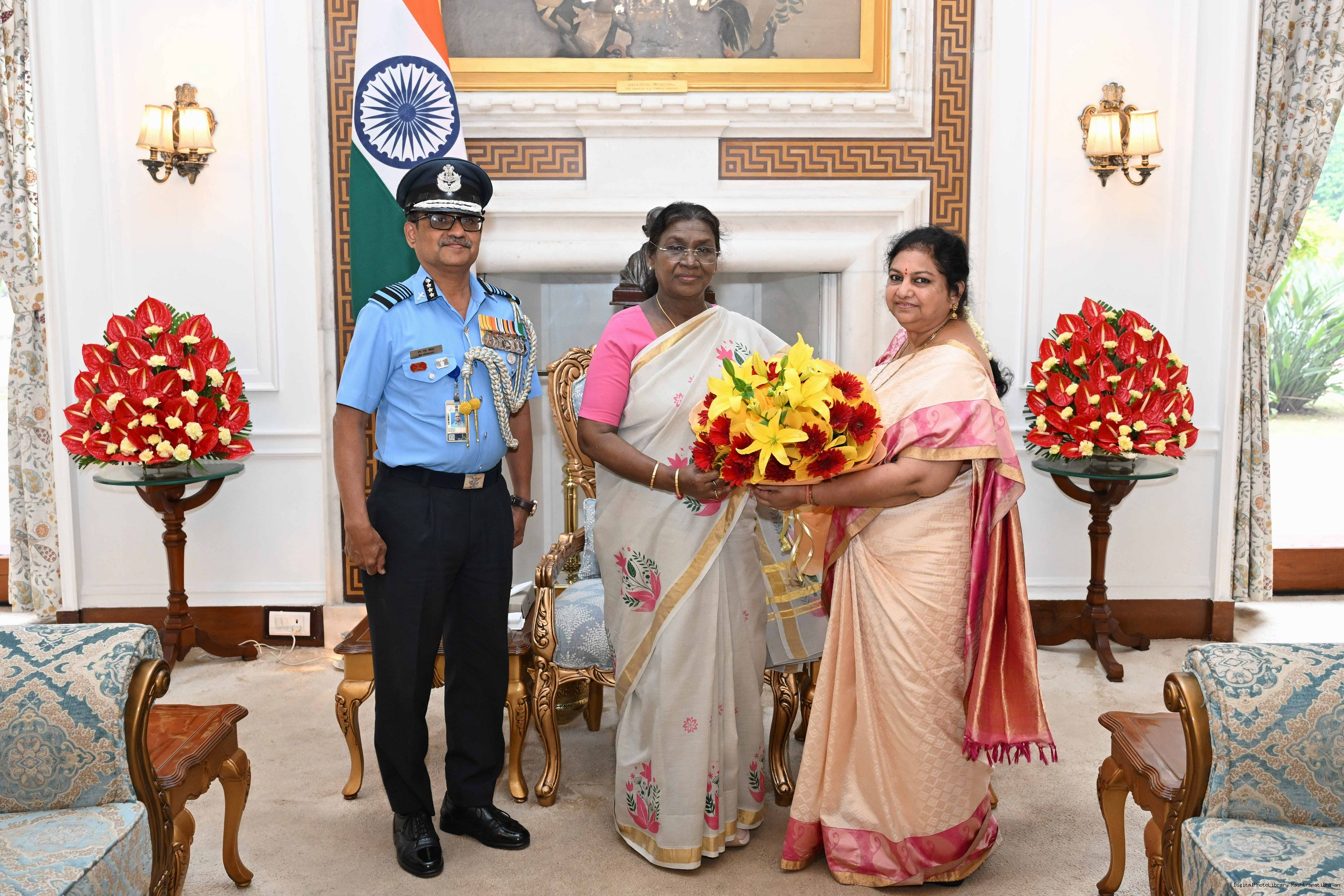 Air Marshal MS Sridhar, Med Dy Chief Integrated Defence Staff along with spouse Smt. H. Uma meeting with the President of India, Smt Droupadi Murmu at Rashtrapati Bhavan on October 28, 2025.