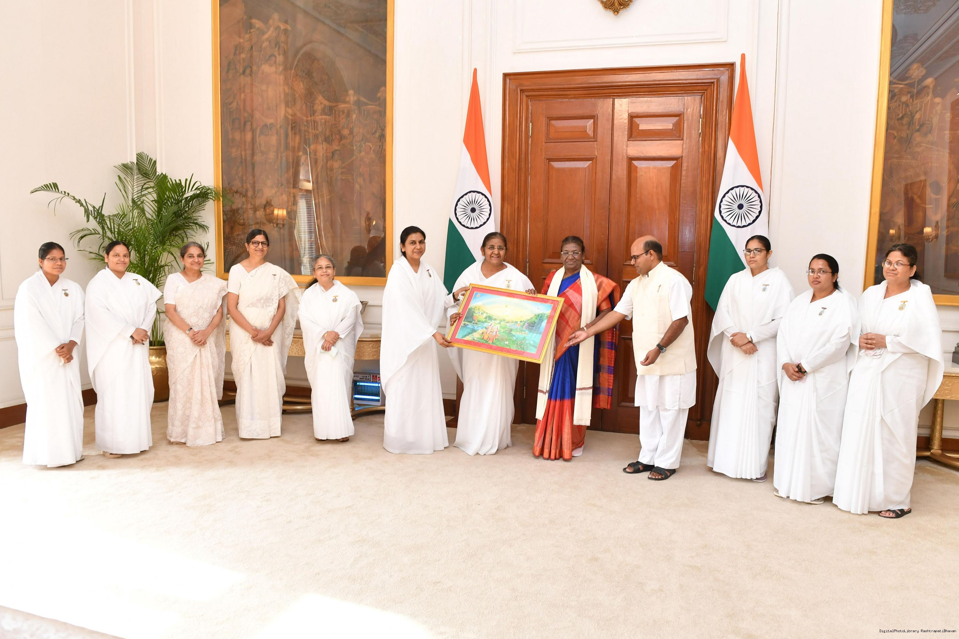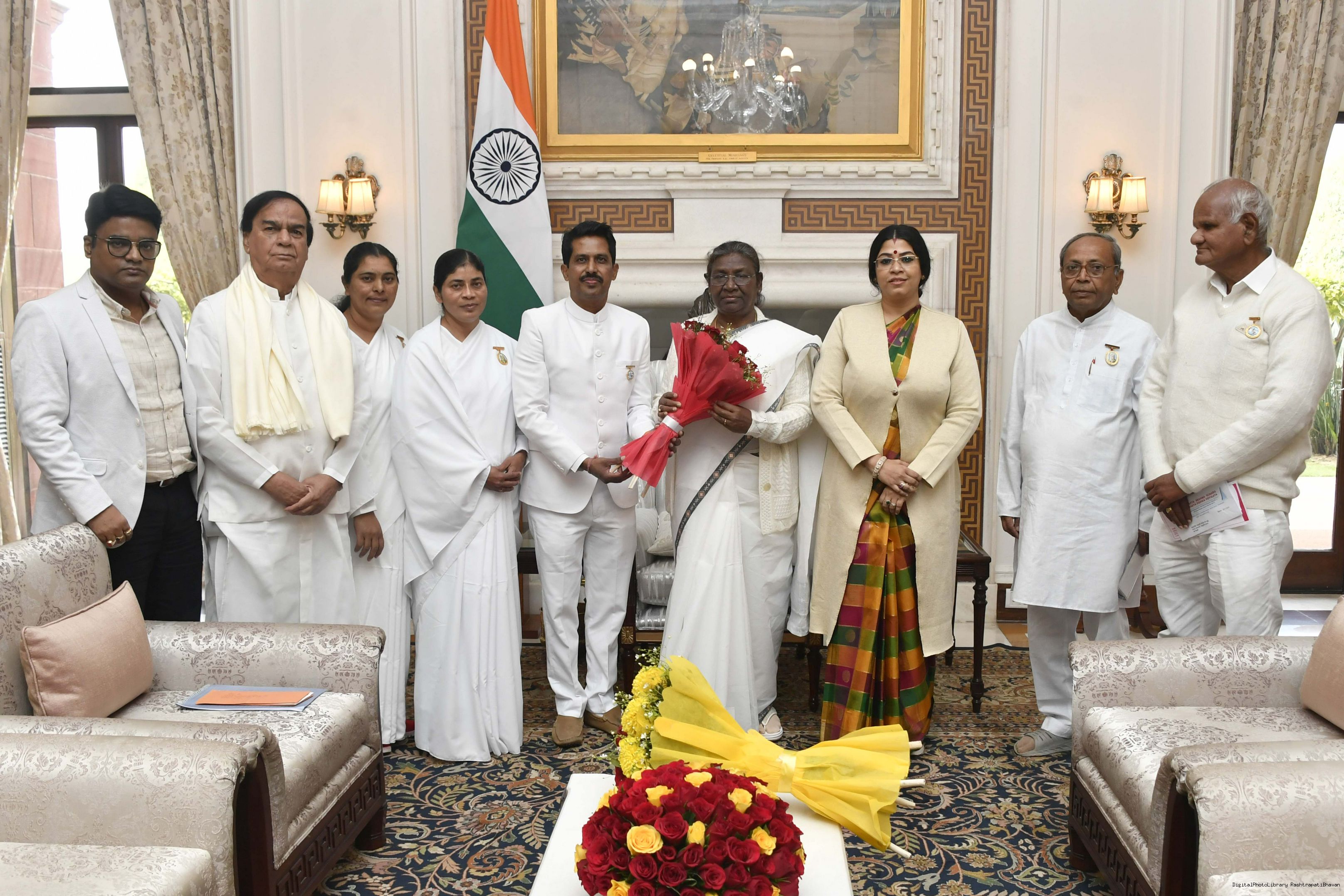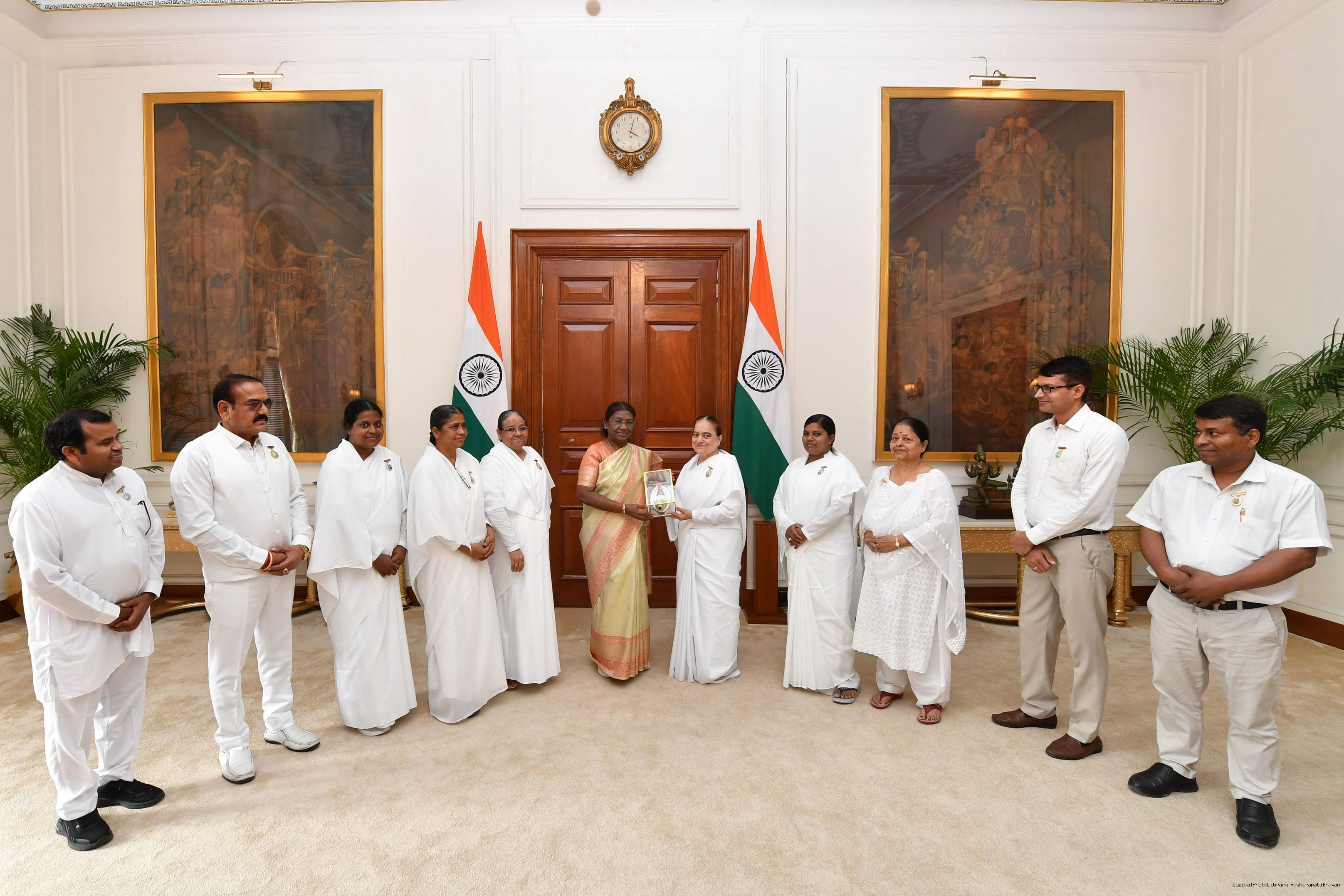 BK Anita Saini, BK Manisha Gurung, BK Jyoti Saini, BK Bharati with others meeting with the President of India, Smt. Droupadi Murmu at Rashtrapati Bhavan on August 10, 2023.