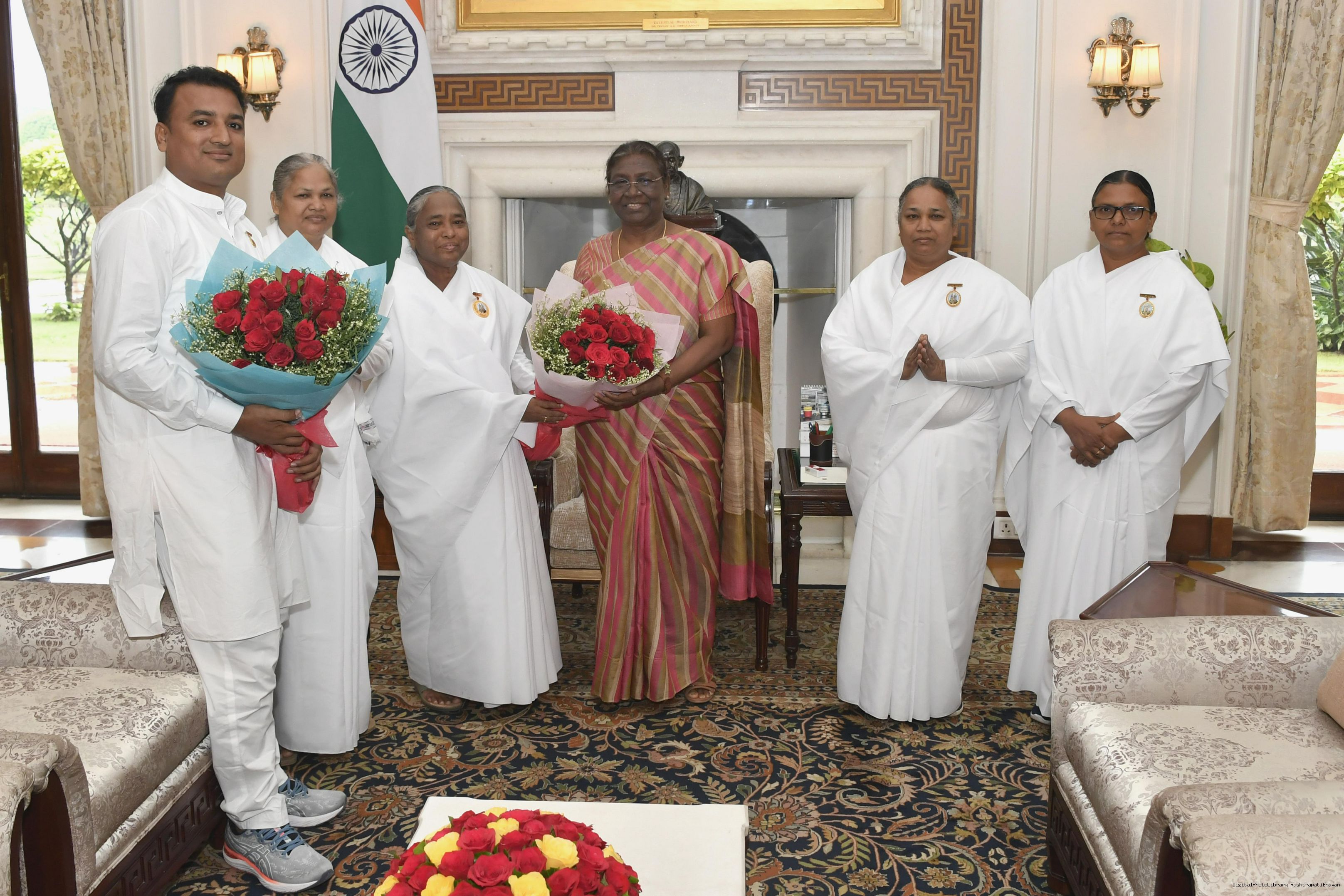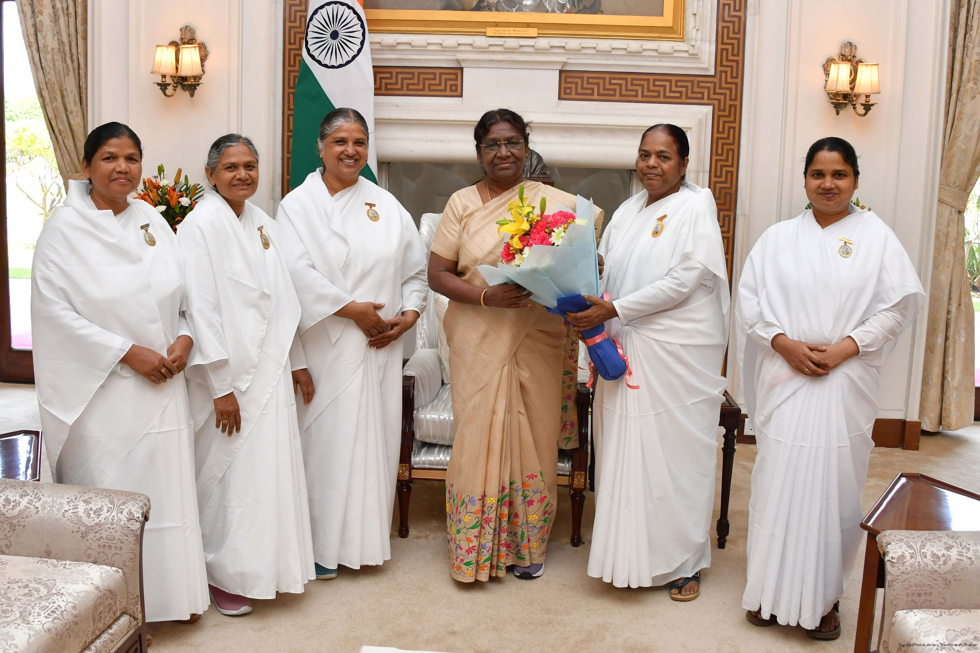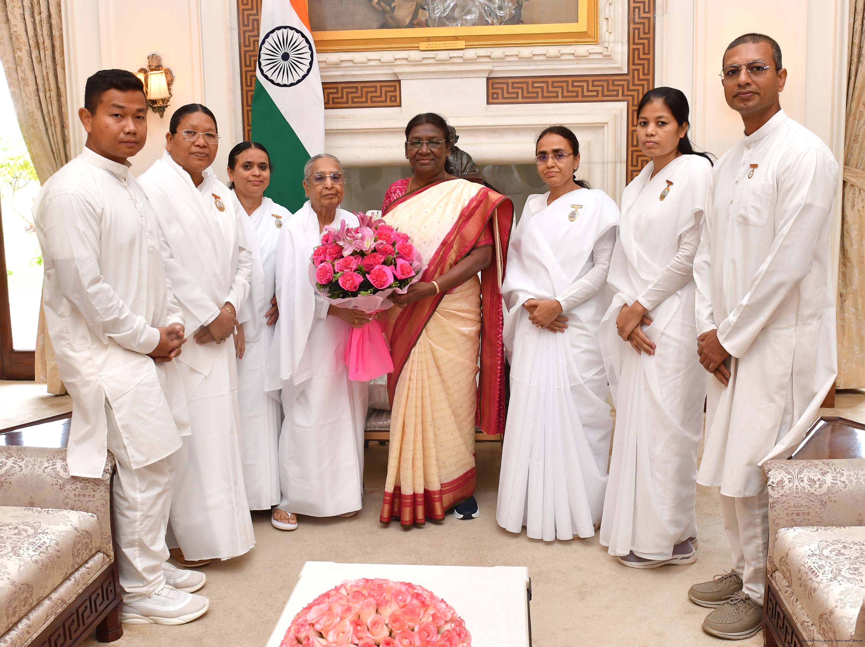 BK Anita Saini, BK Manisha Gurung, BK Jyoti Saini, BK Bharati with others meeting with the President of India, Smt. Droupadi Murmu at Rashtrapati Bhavan on August 10, 2023.