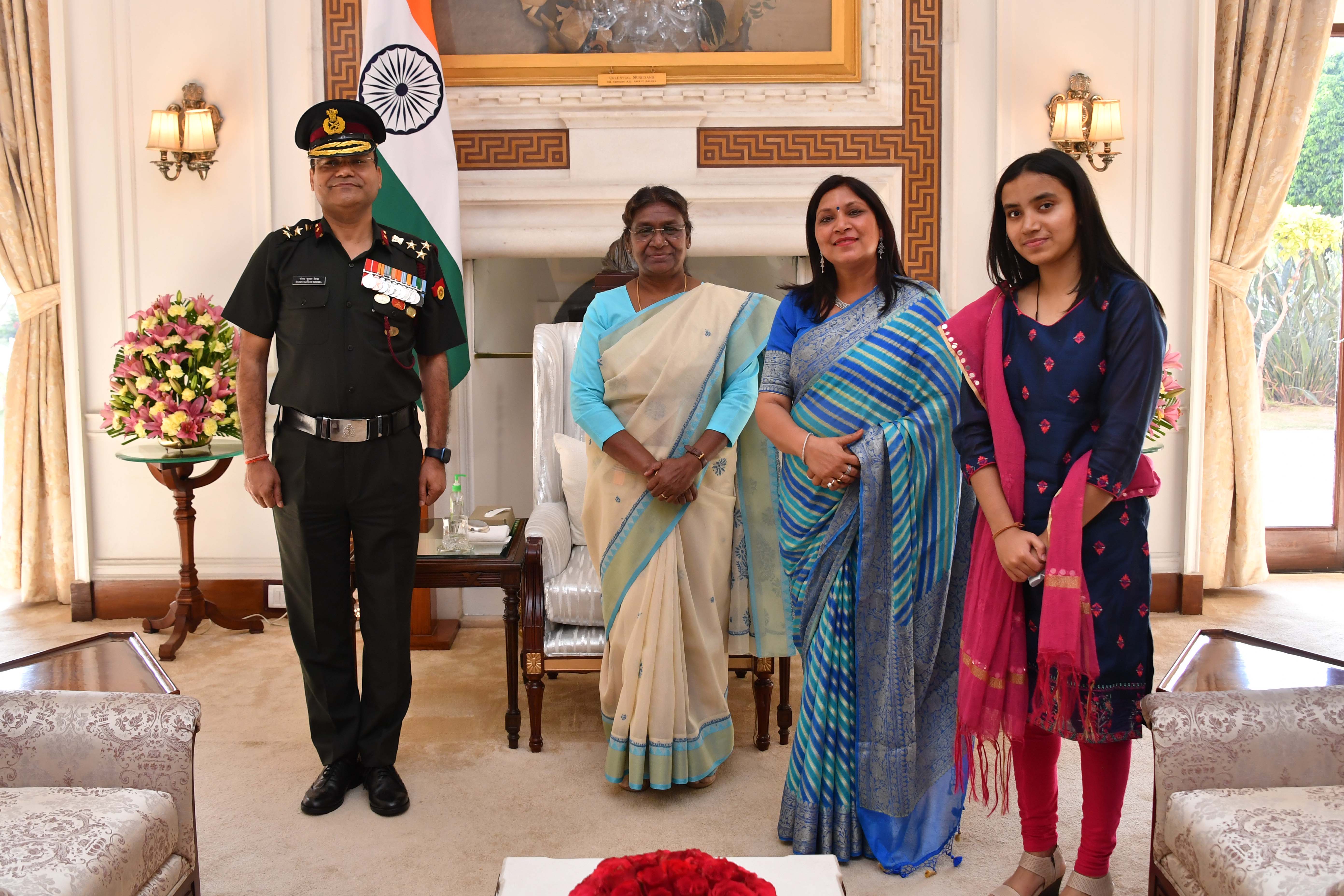 Brig Sanjay Kumar Mishra, AVSM, SM, VSM, Head of Dept of Ophthalmology of Army Hospital (RR), Delhi along with his wife Smt. Manorama Mishra and daughter Ms. Shreeya Mishra Meeting with the President of India Smt. Droupadi Murmu at Rashtrapati Bhavan on April 10, 2023.