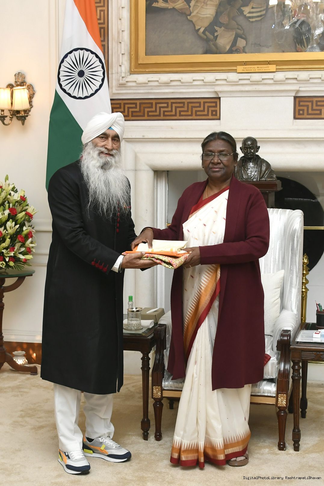 Baba Sukhdev Singh Bedi-Ghuman, Organiser, Guru Nanak International Sewa Mission, Gurdaspur, Punjab meeting with the President of India Smt. Droupadi Murmu at Rashtrapati Bhavan on January 09, 2023.