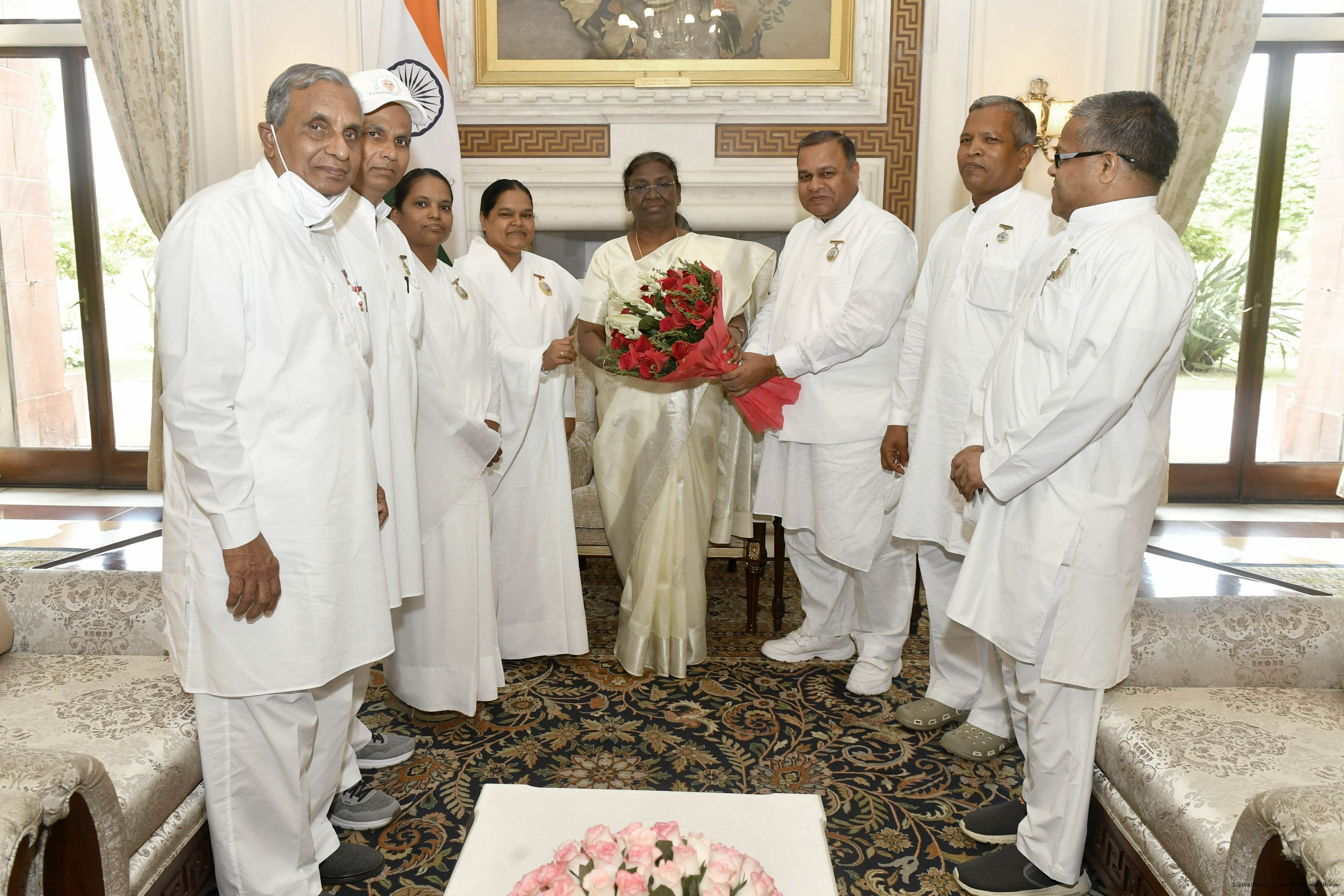 BK Suchita, BK Kavita, BK Bijaya, BK Prabhat, BK Prafulla, BK Bibhuti and BK Sukhdev meeting with the President of India, Smt. Droupadi Murmu, at Rashtrapati Bhavan on Sep 02, 2022.