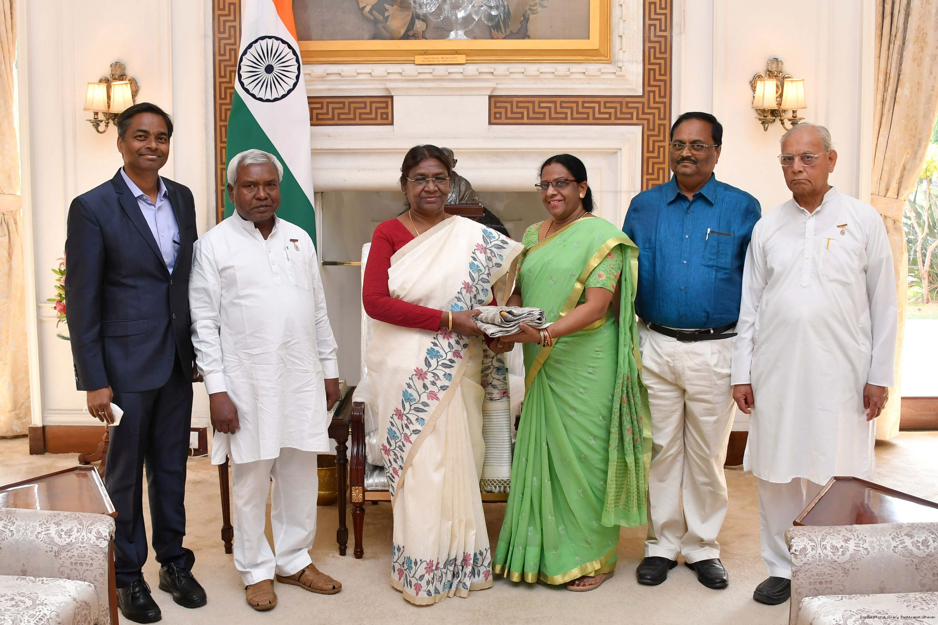 BK Prasanna Kumar Sahu from Rairangpur along with BK Rashmita Prusty, BK Gajendra Kumar Sahu, BK Digambar Singh and BK Kartik Chandra Sahu meeting with the President of India, Smt. Droupadi Murmu at Rashtrapati Bhavan on April 25, 2023
