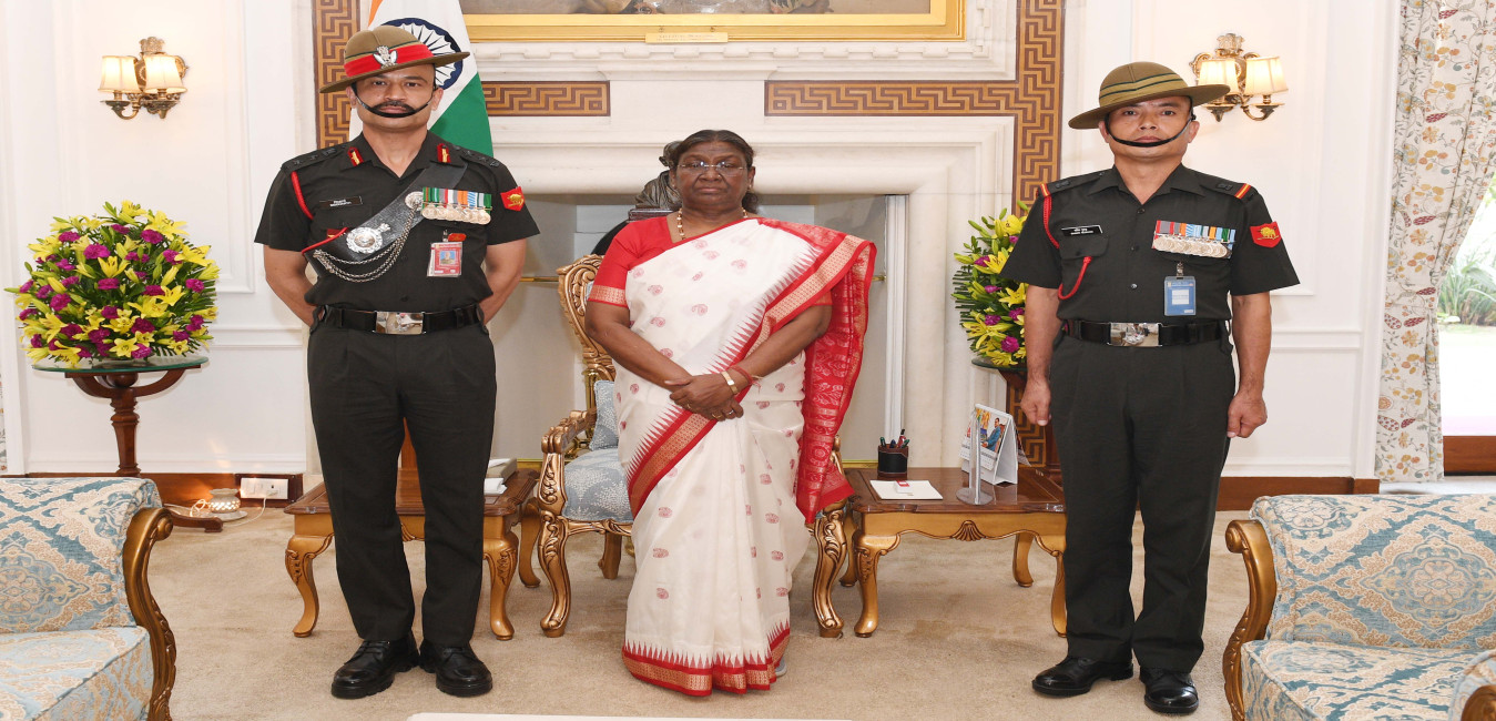 Col Siddharath Dhukia, CO 15 GR (FF) and Sub Maj Shakti Gurung meeting with the President of India Smt Droupadi Murmu at Rashtrapati Bhavan on May 20, 2024.