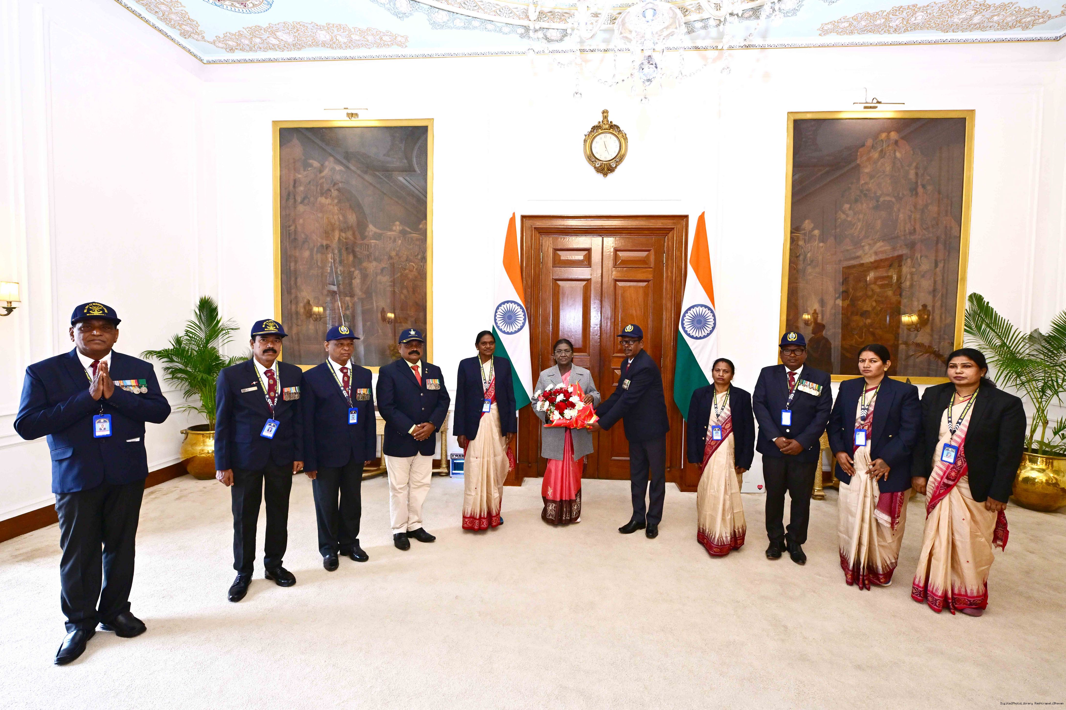 Capt Gurucharan Hembram, President, Ex-Servicesmen Cell, Rairangpur along with others meeting with the President of India, Smt Droupadi Murmu at Rashtrapati Bhavan on January 5, 2025.