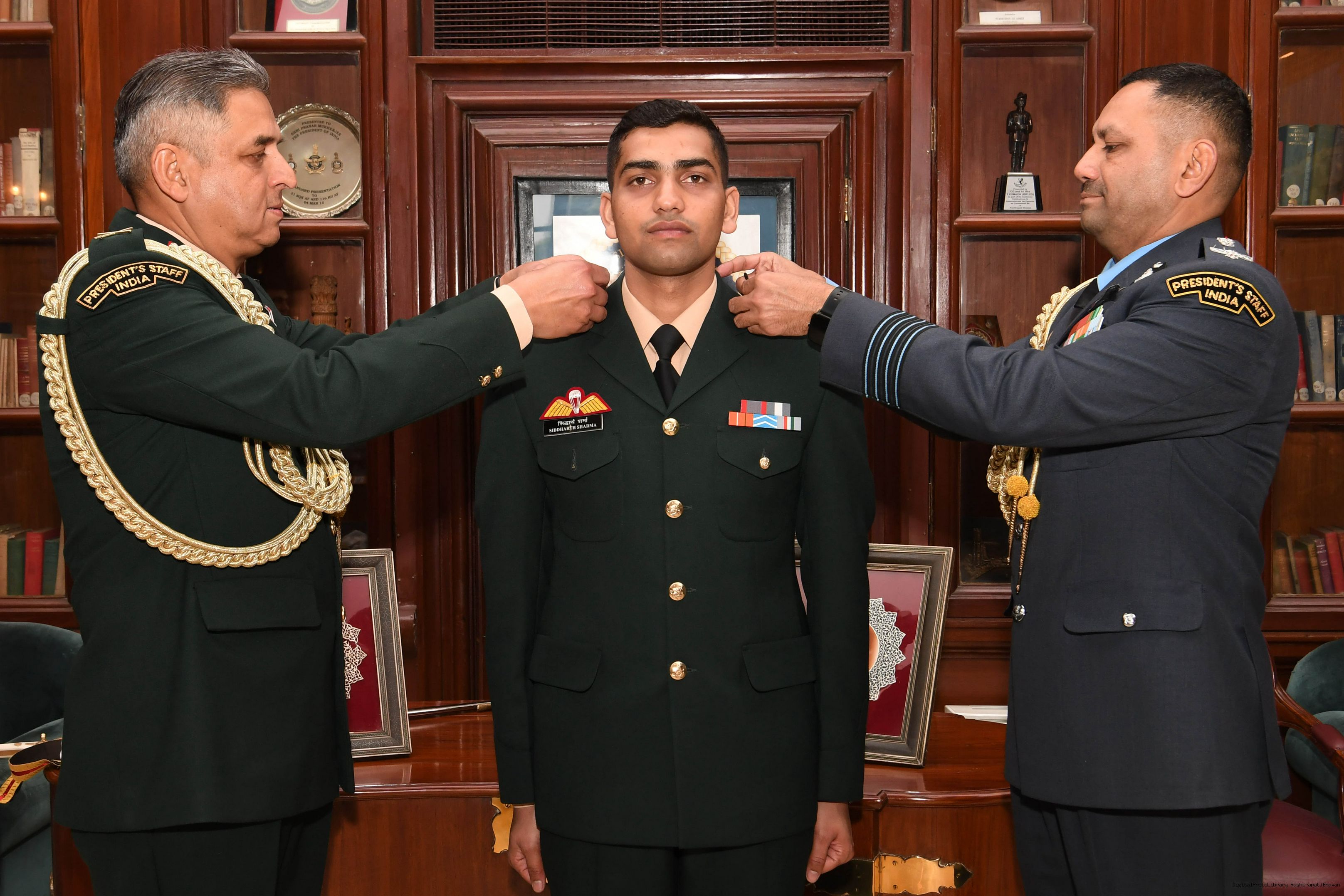 Captain Siddharth Sharma ADC and MWO RK Jangir JCO ADC meeting with the President of India, Smt Droupadi Murmu at Rashtrapati Bhavan on February 11, 2024